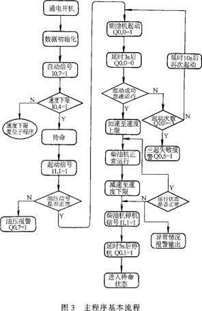 圖3為柴油機自動(dòng)控制的基本功能程序流程圖,其中詳細地表達出了柴油機消防泵組接受起動(dòng)信號起動(dòng)柴油機至穩定工況,及接受停止信號停止柴油機的全自動(dòng)調節過(guò)程。采用西門(mén)子S7—200系列PLC,其強大的功能指令集和基于Windows的編稗工具.使得稗序編寫(xiě)方便簡(jiǎn)單。