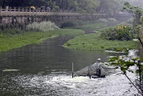 溫州市區九山外河中,一臺潛水離心式曝氣機正在工作,產(chǎn)生涌泉般的水流像“趵突泉”,給河面增添了幾分生氣!∵@種造流曝氣機工作時(shí)能給河水充氧,提高水體溶解氧的濃度,增強水體的自?xún)裟芰,以改善水質(zhì)。在長(cháng)約1公里的九山外河,共有20套造流曝氣機,每天工作8小時(shí)。此外,外河道里還種植了旱傘草、美人蕉等挺水植物,以及睡蓮等浮水植物,共同組成河道的生態(tài)修復工程。