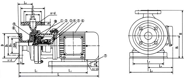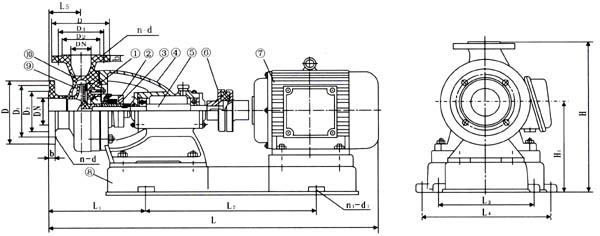6、如果更換滾珠軸承或泵軸時(shí),必須拆下機架,松開(kāi)前端軸承蓋4只螺釘。拆下泵軸后端螺母和聯(lián)軸器,將泵軸向前端方向打出即可,再后拆下后端軸封蓋。