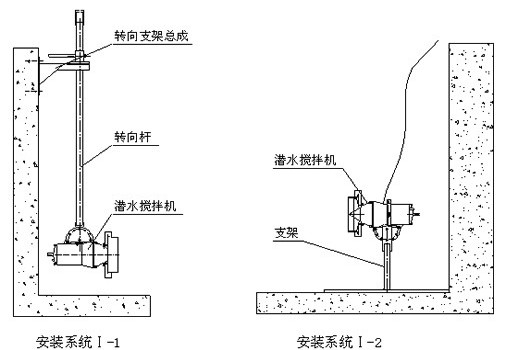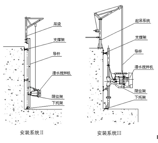安裝系統Ⅰ只適用池深<4m,機型為QJB0.85/8-260/3-740C和QJB1.5/6-260/3-980C攪拌機,其中Ⅰ-1可在水平方向和垂直方向進(jìn)行調節;