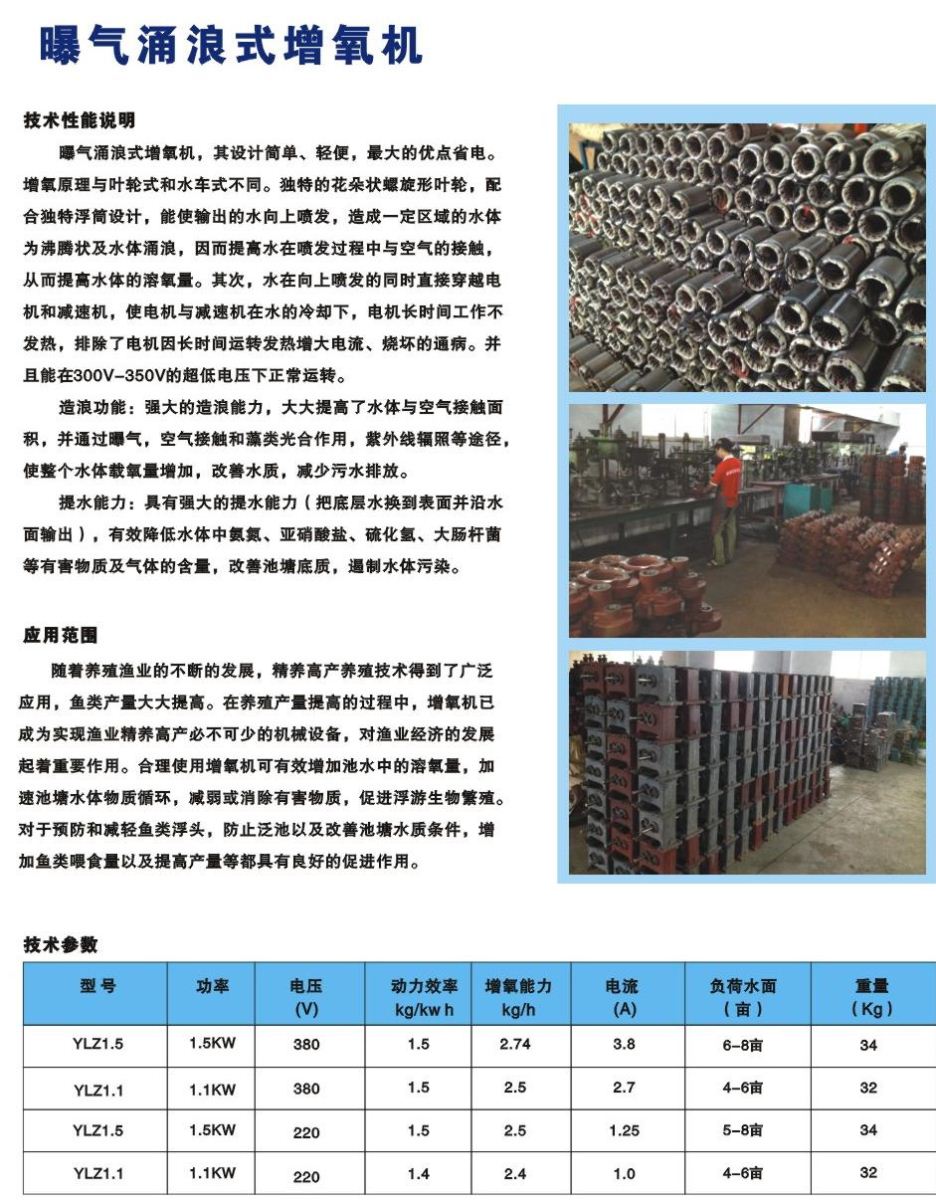 曝氣涌浪式增氧機是目前水產(chǎn)養殖增氧設備中新的產(chǎn)品,其設計大的優(yōu)點(diǎn)是省電。增氧原理與葉輪式和水車(chē)式不同,獨特的花朵狀螺旋形葉輪配合環(huán)形浮筒,能使輸出的水向上噴發(fā),造成一定區域的水體為沸騰狀,因而提高水體在噴發(fā)過(guò)程中與空氣的接觸,從而提高水體的溶氧量。同時(shí)水在向上噴發(fā)時(shí)直接穿越電機和減速機,使電機與減速機在水的冷卻下實(shí)現長(cháng)時(shí)間工作不發(fā)熱,排除了電機因長(cháng)時(shí)間運轉導致的發(fā)熱、電流增大、燒壞的通病,并且能在300—350瓦的超低電壓下正常運轉。