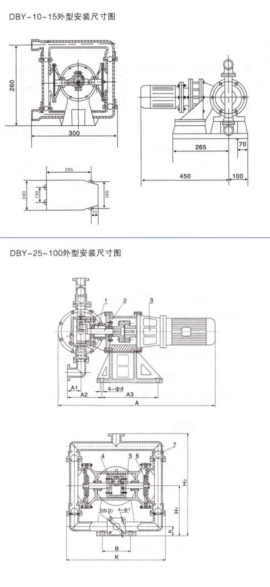 DBY-50-65-80-100擺線(xiàn)式流體部位內襯氟防爆電動(dòng)隔膜泵外型尺寸圖