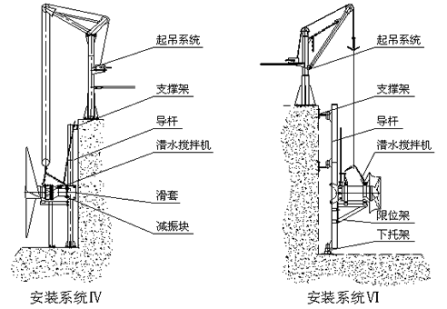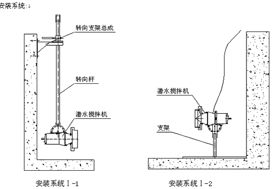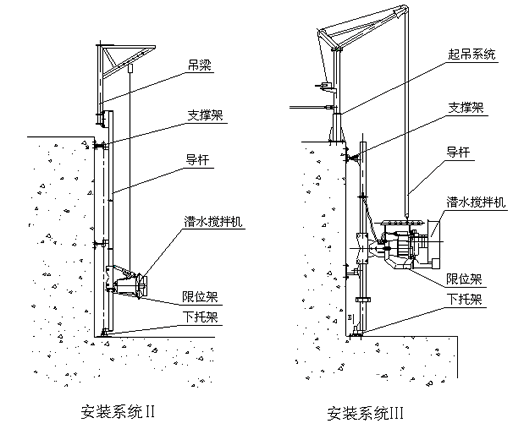 安裝系統Ⅰ只適用池深<4m,機型為QJB0.85/8-260/3-740C和QJB1.5/6-260/3-980C攪拌機,其中Ⅰ-1可在水平方向和垂直方向進(jìn)行調節;