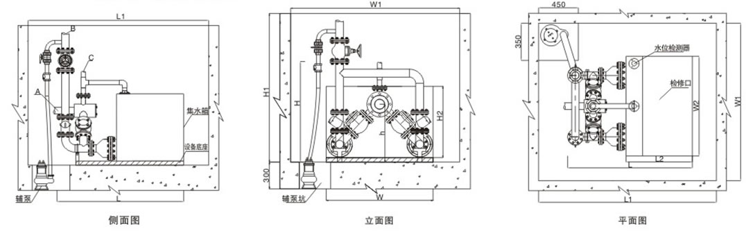 當設備安裝在設備坑內時(shí),設備應配置一臺輔助水泵,目的是為了便于排出意外產(chǎn)生的積水,輔助水泵安裝在設備旁邊的預制集水槽內。
