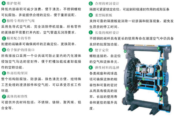 QBY氣動(dòng)隔膜泵不需灌引水,吸程高達7m,揚程達50m,第3代或第4代的產(chǎn)品可以達到80米左右,出口壓力≥7kgf/cm2; 流動(dòng)寬敞,通過(guò)性能好,允許通過(guò)大顆粒直徑達10mm。抽送泥漿、雜質(zhì)時(shí),對泵磨損甚微; 揚程、流量可通過(guò)氣閥開(kāi)度實(shí)現無(wú)級調節(氣壓調節在1-7kgf/cm2之間); 該氣動(dòng)隔膜泵無(wú)旋轉部件,沒(méi)有軸封,隔膜將抽送的介質(zhì)與泵的運動(dòng)部件、工作介質(zhì)完全隔開(kāi),所輸送的介質(zhì)不會(huì )向外泄漏。所以抽送有毒、易發(fā)揮或腐蝕性介質(zhì)時(shí),不會(huì )造成環(huán)境污染和危害人身安全; 不必用電,在易燃、易爆場(chǎng)所使用安全可靠; 可以浸沒(méi)在介質(zhì)中工作;