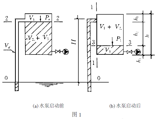泵啟動(dòng)后,液面下降,達到穩定運行工作后,罐內應存有一定體積量V3的水,而氣體之外的罐內空氣體積為V1+V2。罐內部的壓力為P1,壓力小于外界大氣壓力Pa。