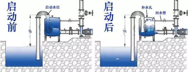 當水泵啟動(dòng)之后,水泵會(huì )先抽取真空罐內的水,真空罐內的液位下降,管內形成真空,壓力低于水池液面的大氣壓力,此時(shí)水就會(huì )沿著(zhù)吸入管進(jìn)入真空罐。當水泵的排液和吸入管路的進(jìn)液達到平衡,真空罐內的液位也就不會(huì )再下降,達到穩定工作狀態(tài)。泵也就達到了額定工作狀態(tài),源源不斷地將水輸送出去(公眾號:泵管家)。