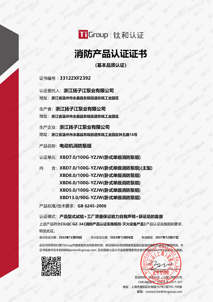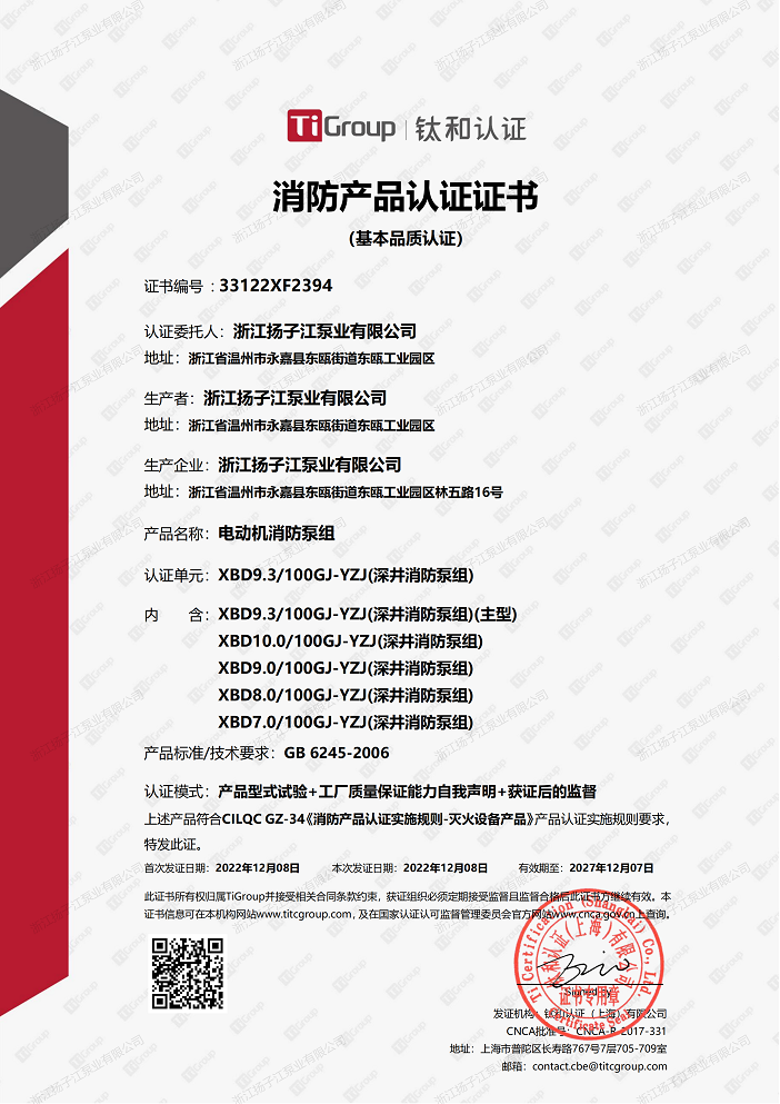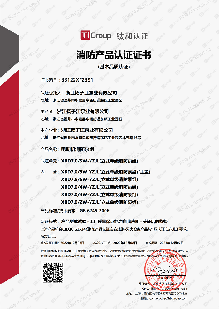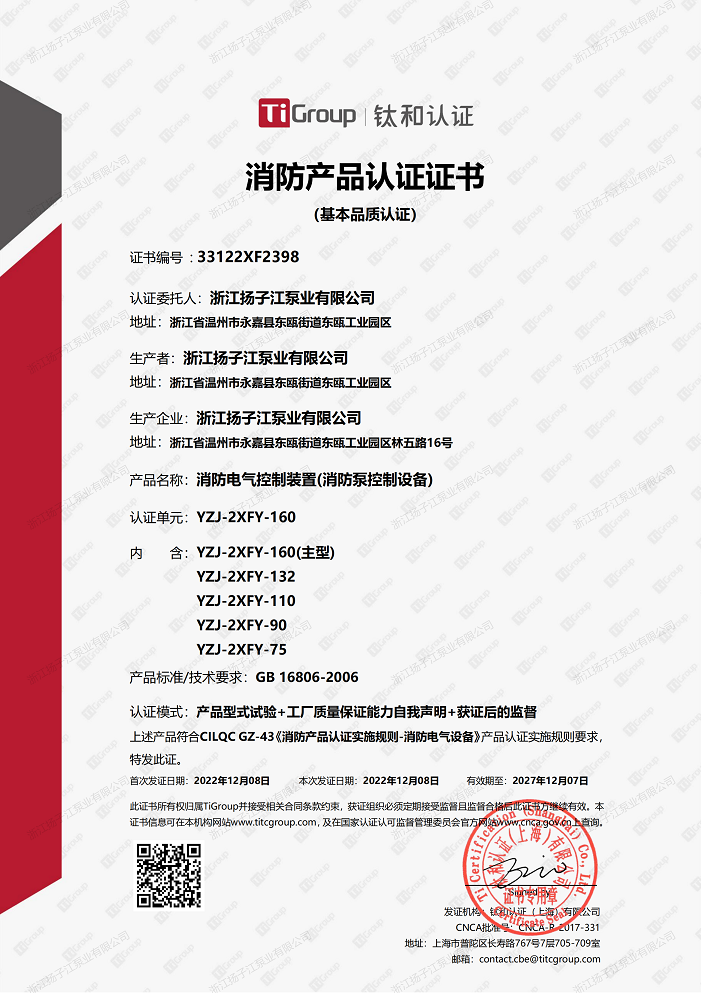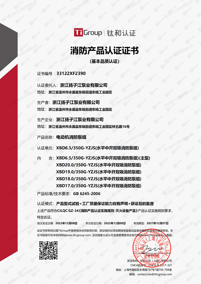 日前,浙江揚子江泵業(yè)順利通過(guò)消防泵柴油機消防泵穩壓成套及控制柜消防電氣控制裝置消防產(chǎn)品認證.