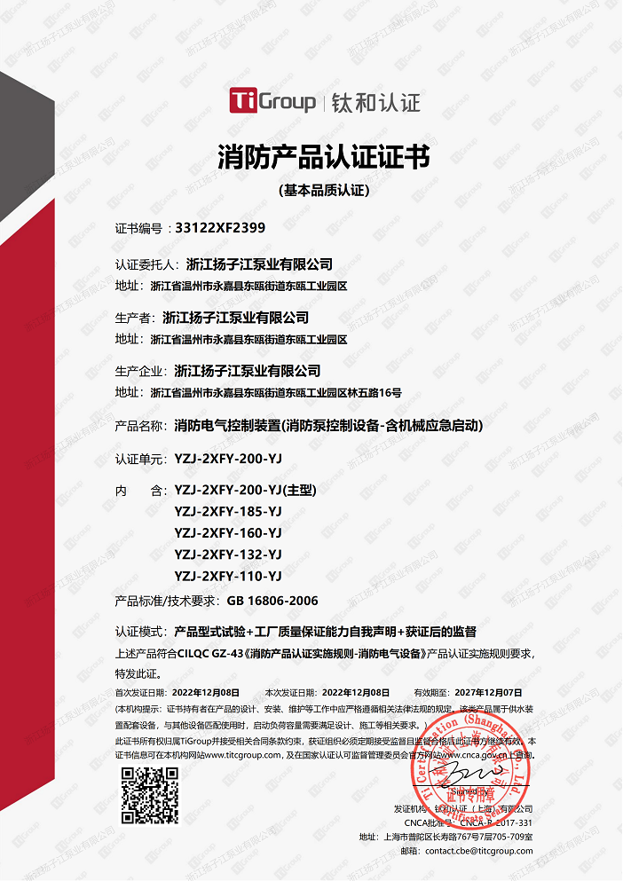 揚子江泵業(yè)順利通過(guò)消防泵柴油機消防泵穩壓成套及控制柜消防電氣控制裝置消防產(chǎn)品認證