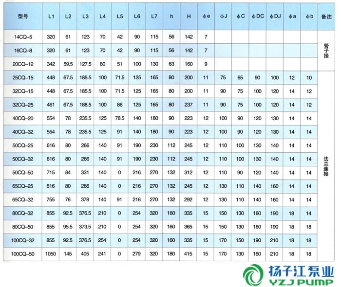 二、CQ型磁力驅動(dòng)泵安裝尺寸表: