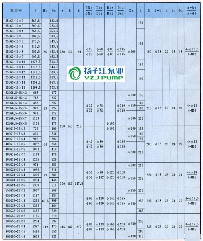 LG型高層建筑多級給水泵安裝尺寸表: