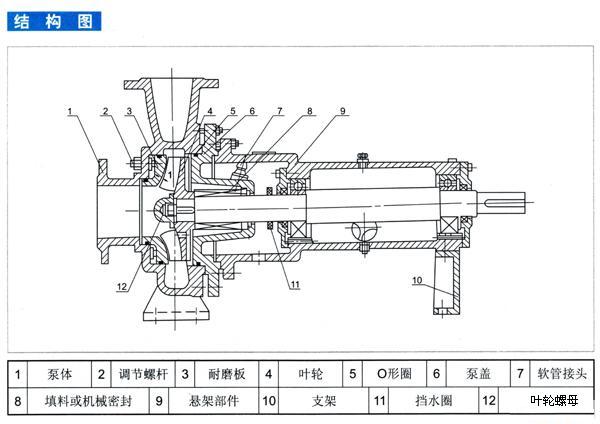 1. XWJ型紙漿泵為單級單吸懸臂式結構,主要山泵體、葉輪、泵蓋、耐磨板及懸架部件組成;