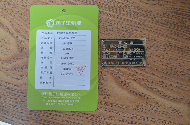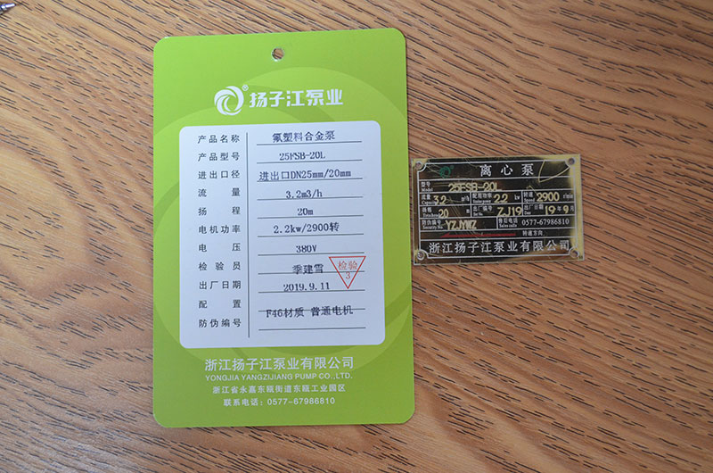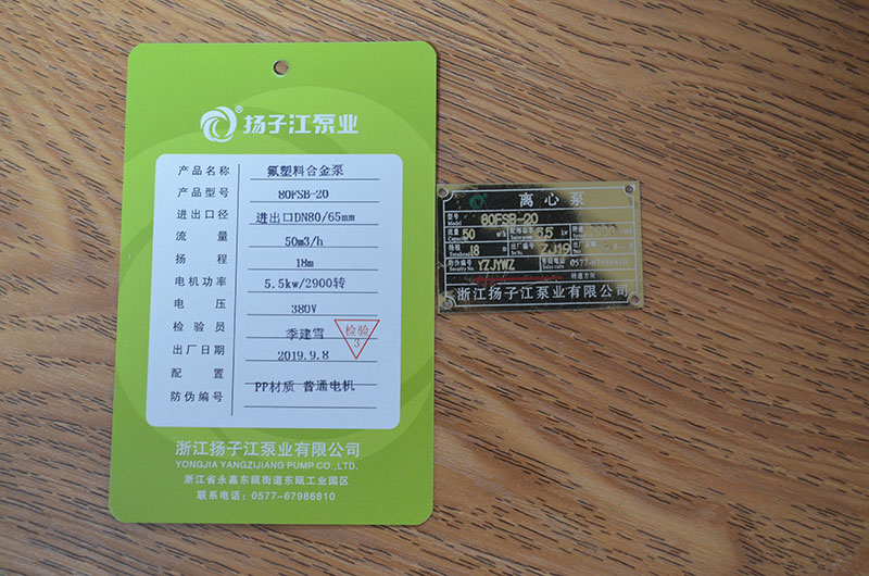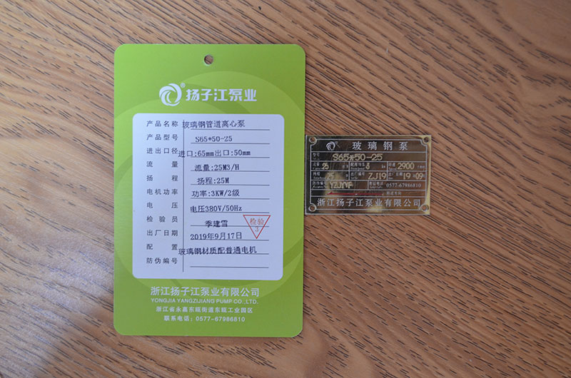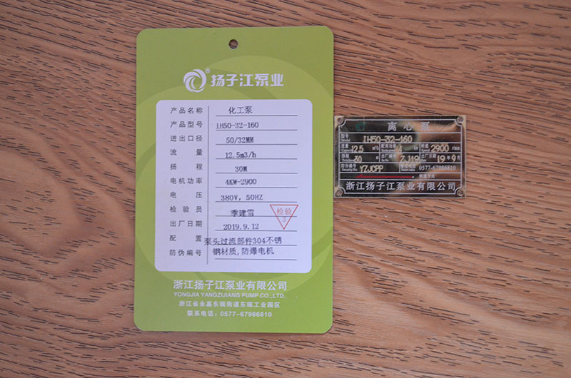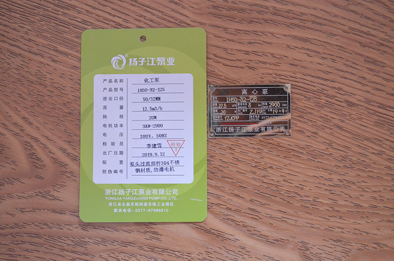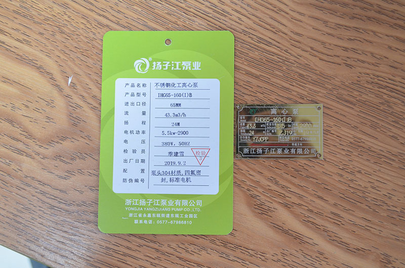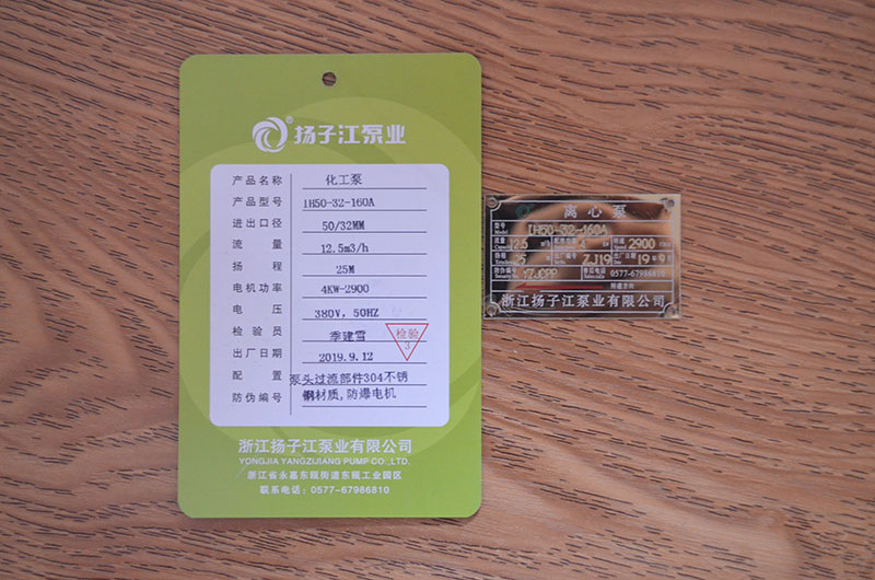 化工泵產(chǎn)品合格證_浙江揚子江泵業(yè)有限公司