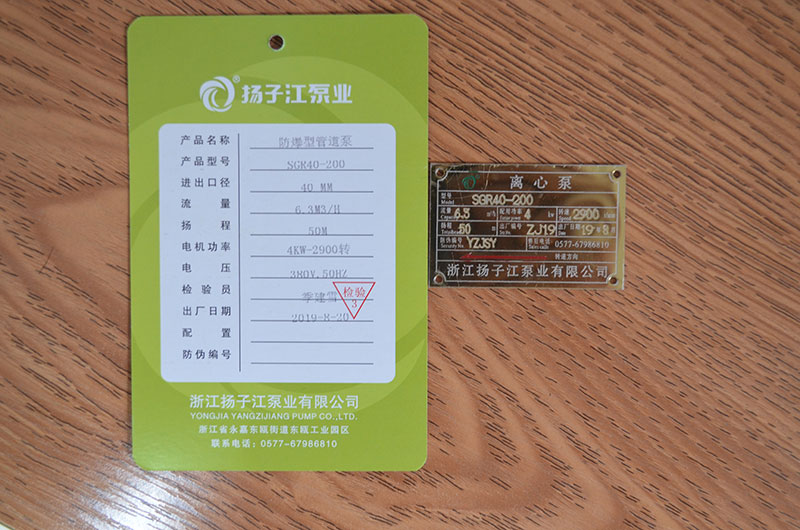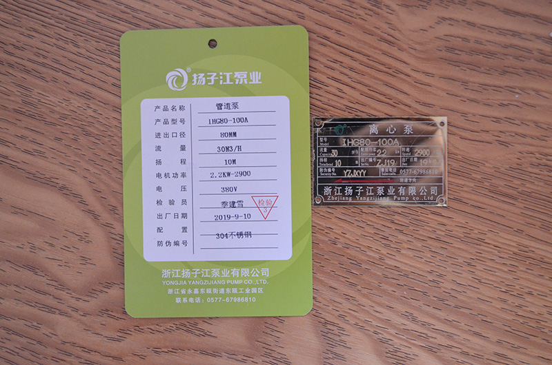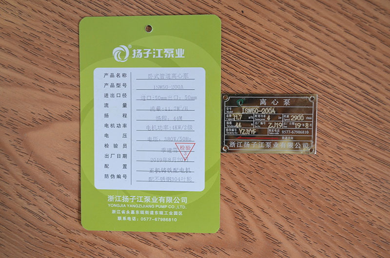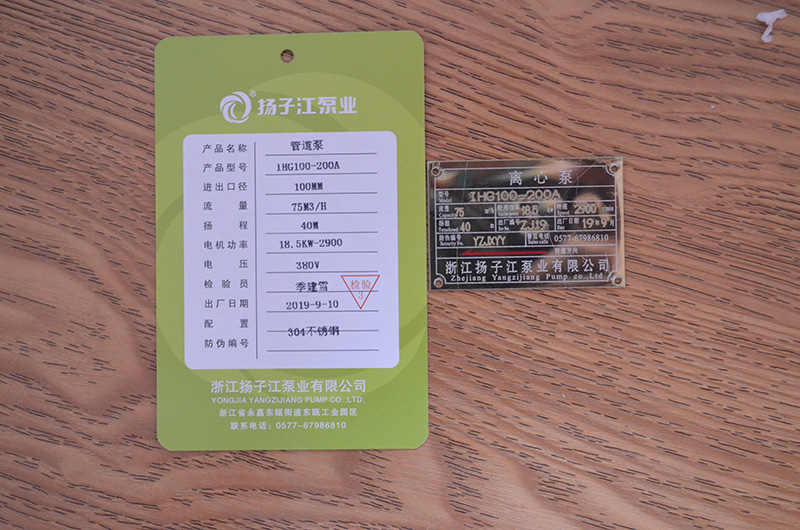 管道泵產(chǎn)品合格證_浙江揚子江泵業(yè)有限公司