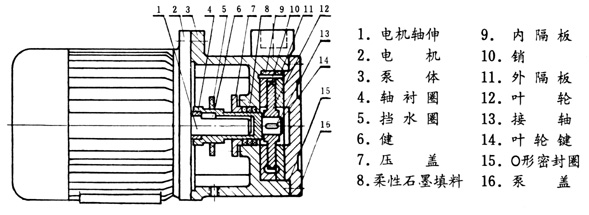 本泵采用泵與電機直聯(lián)結構,其進(jìn)水口為水平方向,吐出口垂直向上。 從泵端看,泵為逆時(shí)針轉動(dòng)。 葉輪可在懸臂軸上自由滑動(dòng),運轉時(shí)能自動(dòng)調正葉輪二面的間隙,外隔板可借助于葉輪上的二螺孔與葉輪一起拆出葉輪,內隔板采用9-4鋁鐵青銅,軸采用不銹鋼,填料采用新型密封材料柔性石墨。 本泵性能穩定,結構得意,拆裝方便。