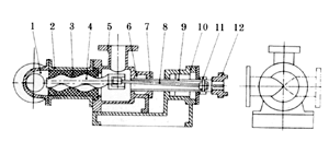I-1B系列濃漿泵是單螺桿式容積回轉泵,該泵利用偏心單螺旋的螺桿在雙螺旋襯套內的轉動(dòng),使濃漿液沿螺旋槽由吸入口推移至排出口,實(shí)現泵的輸送功能。