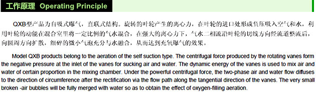 QXB型潛水離心式曝氣機采用電機和葉輪直接傳動(dòng),利用葉輪旋轉所產(chǎn)生的離心力排開(kāi)周?chē)纬傻蛪簠^吸入水流同時(shí),在葉輪進(jìn)口處制造真空而吸入空氣,在混氣室中氣與水充分混合形成均勻的氣水混合液,在離心力作用下快速排出。由于水流噴射極強,造成有效的水流循環(huán),使空氣被剪切成大量的微小氣泡。極大提高了其表面積,且由于氣泡上升緩慢使空氣中大量的氧溶于水中,使得該機動(dòng)力效率優(yōu)于其它種類(lèi)的曝氣機。