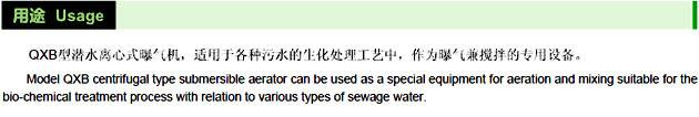 QXB型潛水離心式曝氣機用于各種污水處理工程中生化處理工藝的曝氣池、曝氣沉砂池、預曝氣池、好氧硝化池曝氣充氧混合及養殖塘增氧。