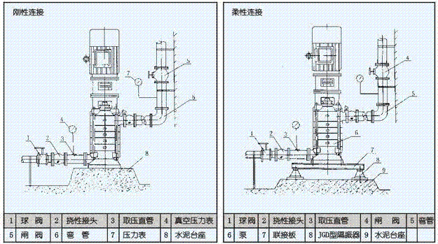 3.泵與底座安裝有兩種方式,一種是直接裝在水泥基礎上的剛性連接,另一種是采用JGD型減振器安裝的柔性連接,具體方法見(jiàn)安裝示意圖所示。