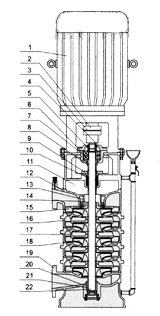 DL型立式多級離心泵由電機和泵兩部分組成,電機為Y型三相異步電機,泵和電機采用聯(lián)軸器連接,整體為剛性連接,使用時(shí)無(wú)需校正。泵由定子部分和轉子部分組成。泵定子部分由進(jìn)水段、中段、導葉、出水段、填料函體等零件組成。為防止定子磨損,定子上裝有密封環(huán)、平衡套等,磨損后可用備件更換。轉子部分由軸、葉輪、平衡轂等組成。轉子下端為水潤滑軸承,上部為角接觸球軸承,DL立式多級離心泵的軸向力絕大部分由平衡鼓來(lái)承擔,其余小部分殘余軸向力幅角接觸球軸承來(lái)承受。進(jìn)水段和出水段和結合面用紙墊通過(guò)接緊達到密封。軸封采用填料或機械密封,用戶(hù)可根據需要選擇。